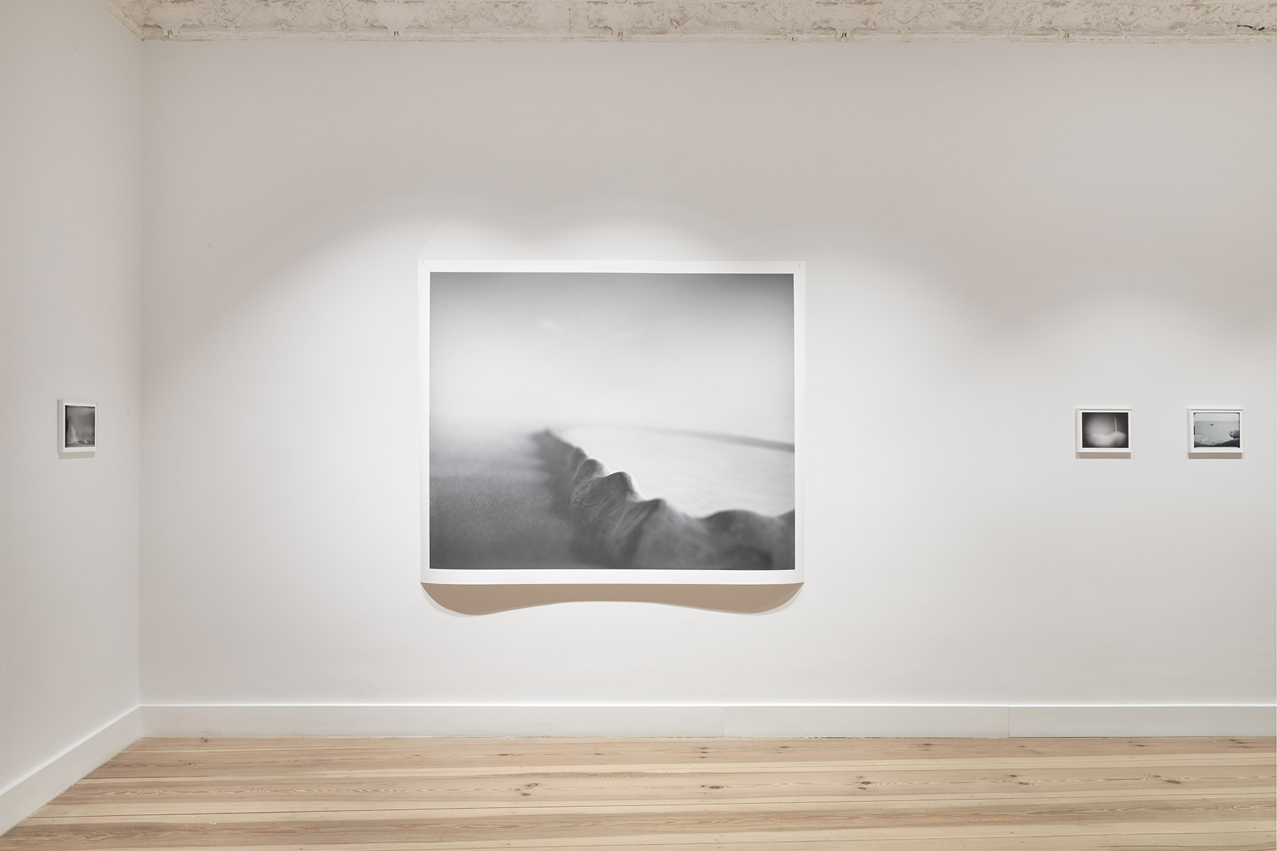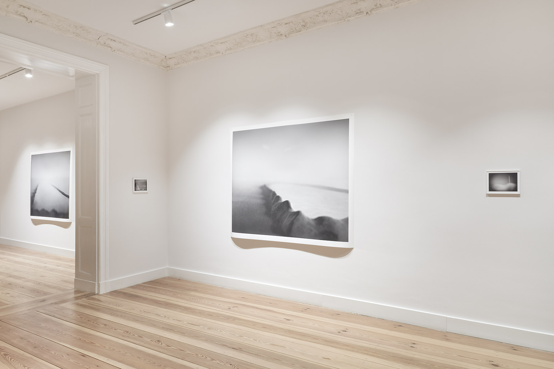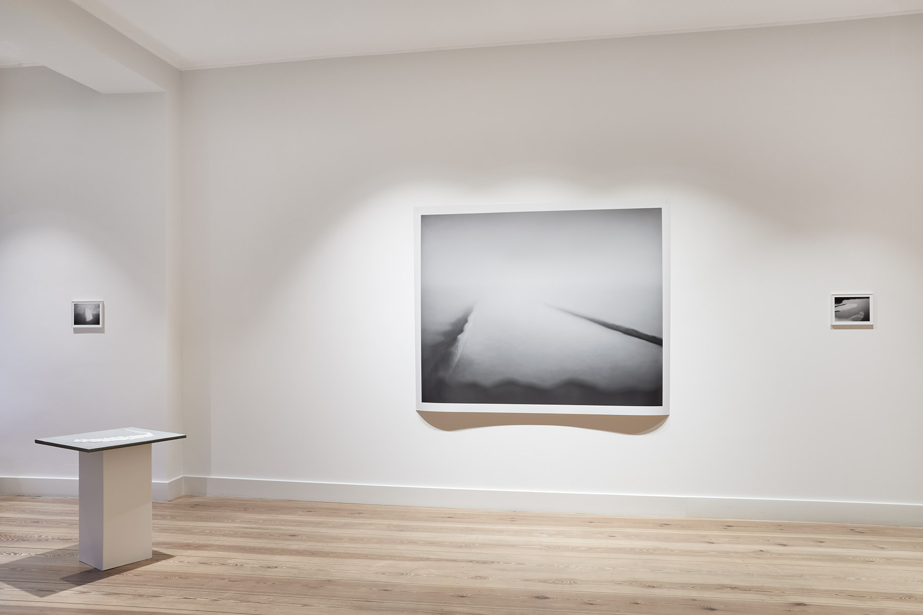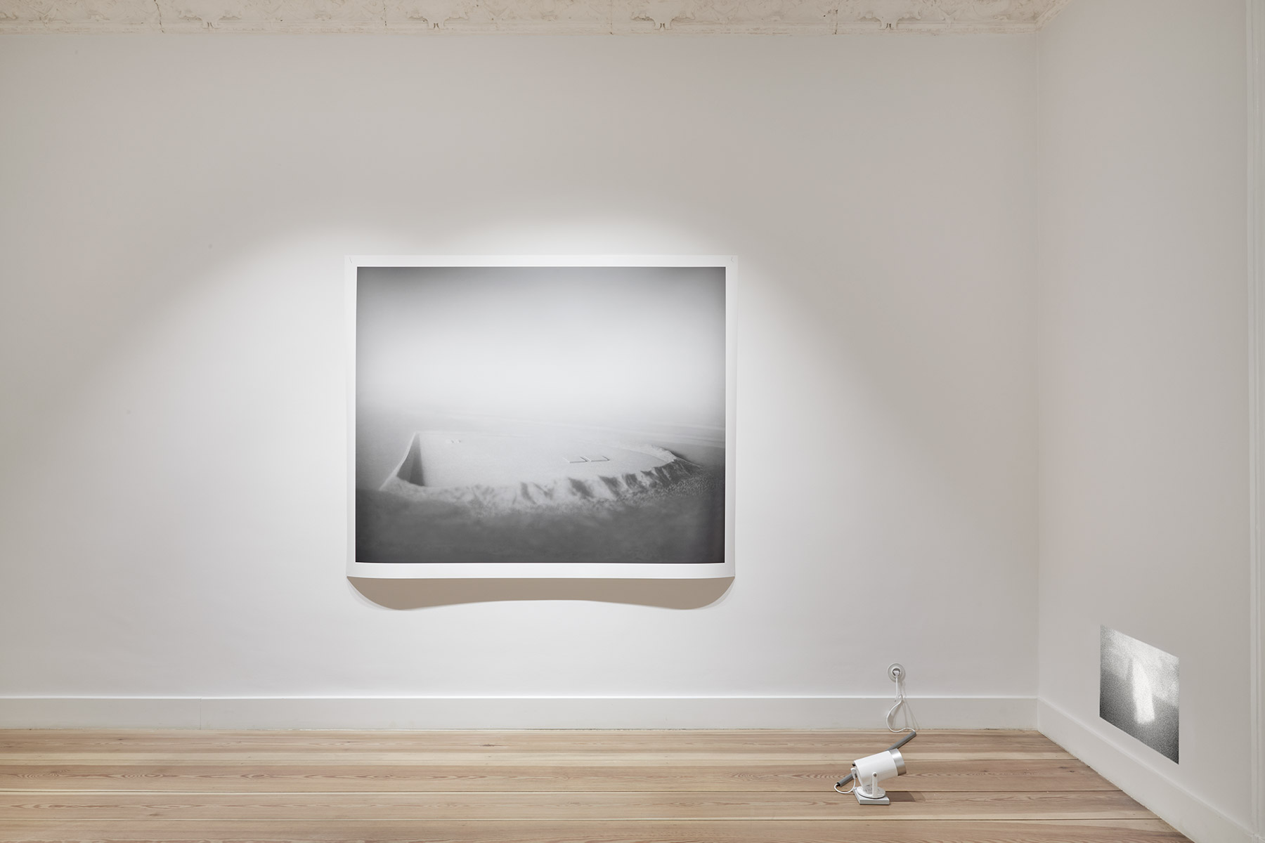 A fog hangs over the mysterious black-and-white photographs and film sequences. They exert a fascination that we cannot escape. Where are these worlds? What are we seeing? Everything seems real and unreal at the same time. Between mountain slopes, we see a glacier pouring into a lake, the moon in the midst of a cloud illuminated by its light, an area enclosed by a low wall, perhaps an ancient site. Blurred and pixelated, we see short films with similar motifs: a lonely iceberg in the water, walls and stones in no man’s land.