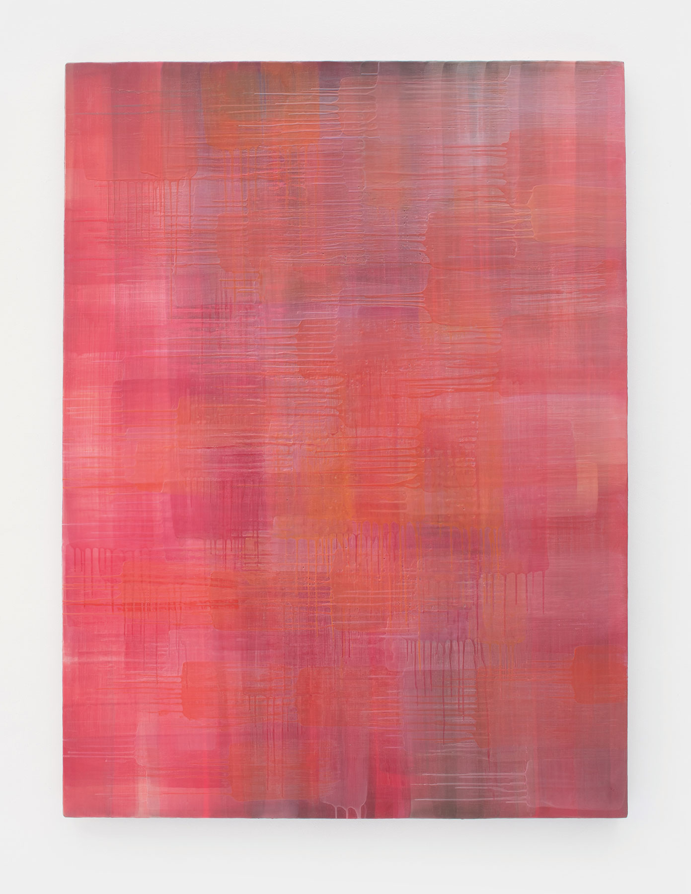In the works entitled Metachrome, horizontal and vertical layers of paint create the impression of a dense translucent colour web, with colour shades shining forth from the depth of the work, so that we can follow the process of painting when we look at the works. The materiality of the wax, the brush stroke, and the texture of the applied paint remain visible.