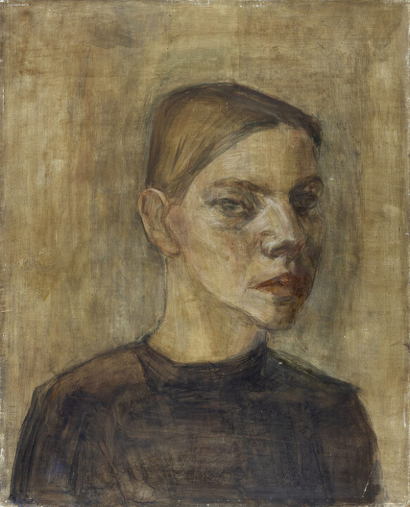 Sabine Herrmann (born in 1961) links objectivity with poetry and dreams, realism with emotion. In the painting Abendlied, a woman bends down as if to put on socks. Her light figure is surrounded by dark colours that lend the depiction a slight sense of melancholia. The early, delicately painted self-portrait, reminiscent of Paula Modersohn-Becker, largely foregoes colour and limits itself to differentiated shades of brown, thus stressing the young face’s serious expression.